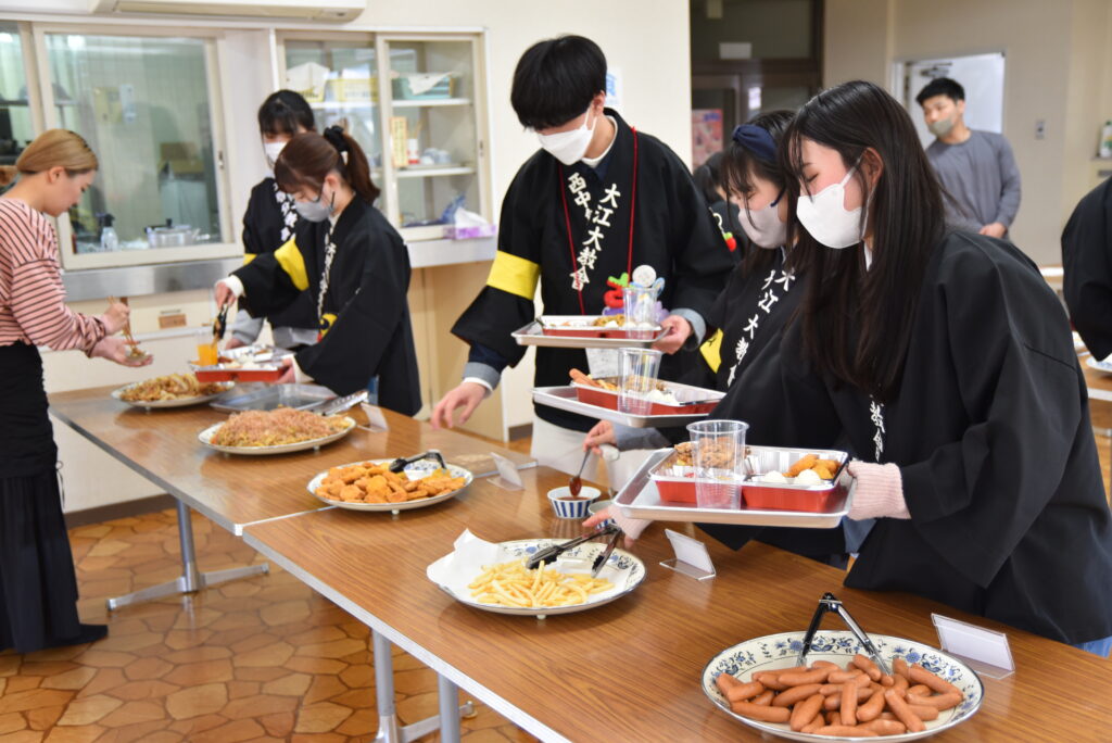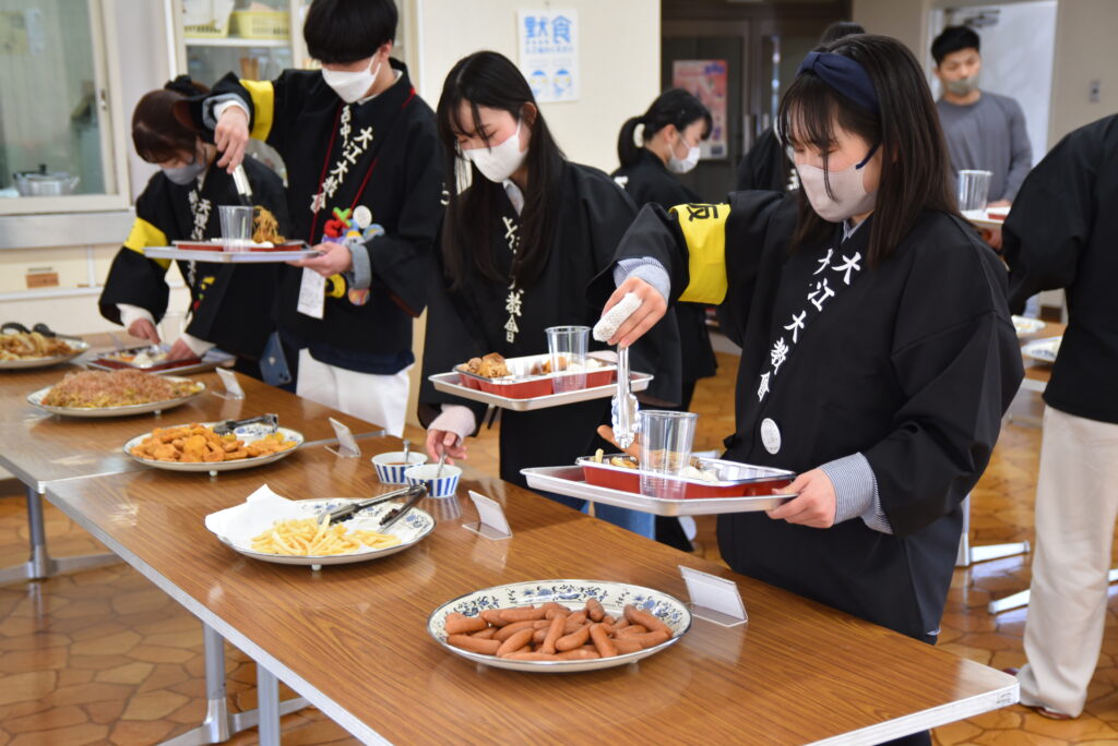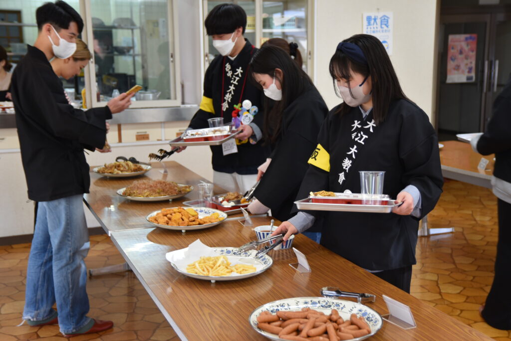 その後、食堂ではバイキング形式での昼食が用意された。焼きそばやピザ、スタミナ焼、サラダなど、婦人会による心のこもった料理を各自思い思いに取り分けての会食は、最初こそ黙食が習慣付いたこともあって会話も遠慮がちな光景が見られたが、時間とともに打ち解けて和やかな雰囲気となった。